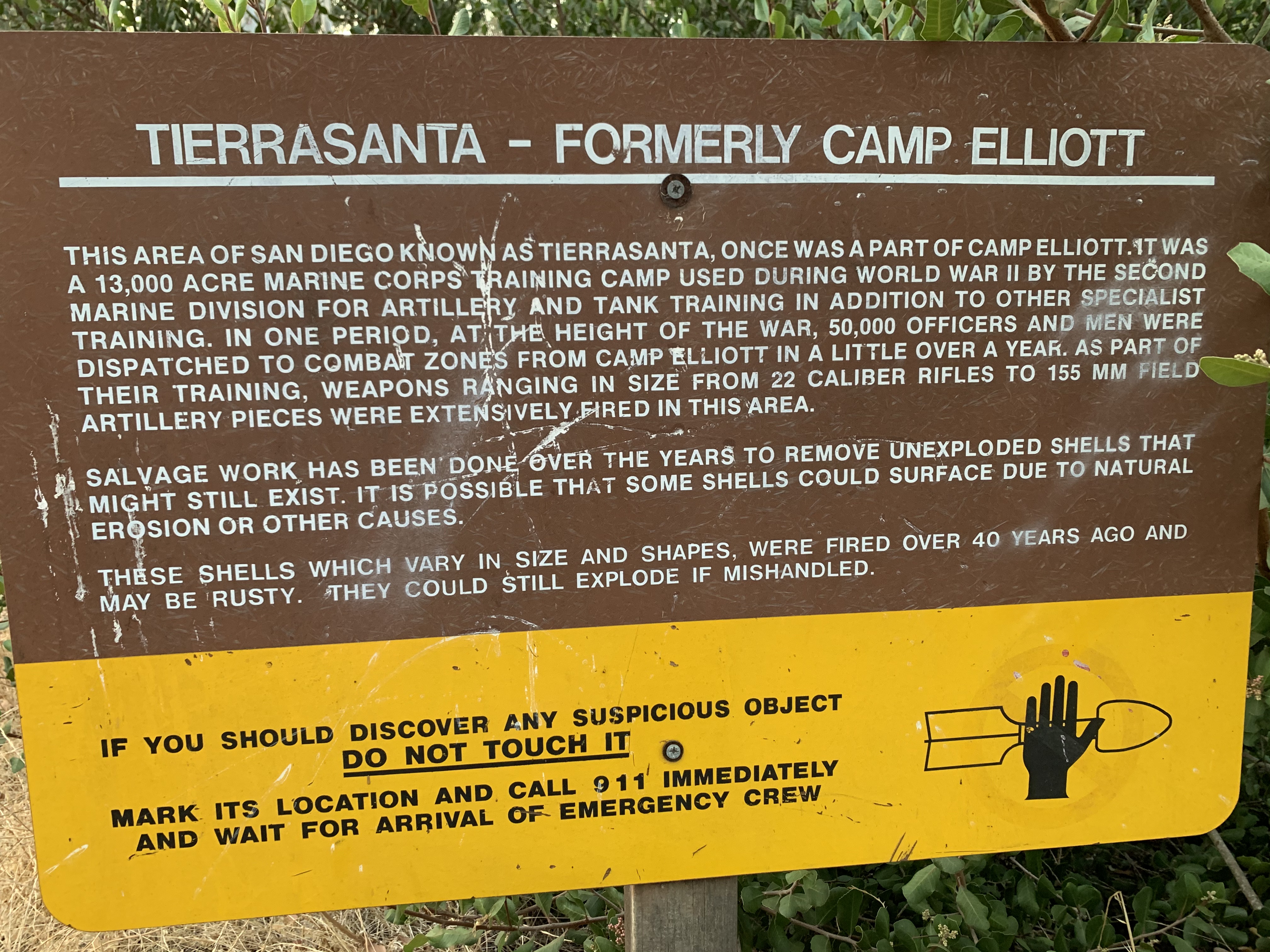 Coming to the end of this first section I arrived at Santo Rd and crossed over to West Shepherd Canyon. At the entrances to all the canyon fingers there are signs warning the public that this area was formerly Camp Elliott, which was a military camp of various types from the 1930s to the 1960s or so. If you see something that looks like a bomb, don’t pick it up.