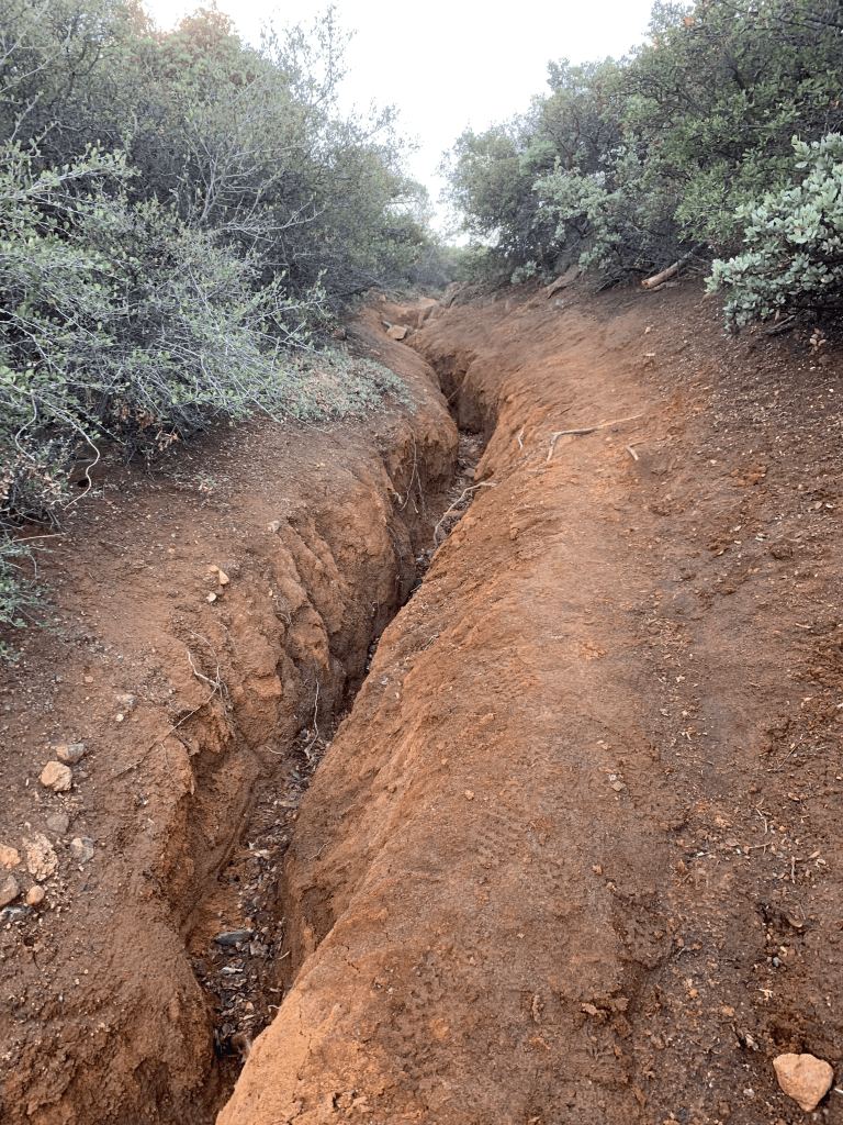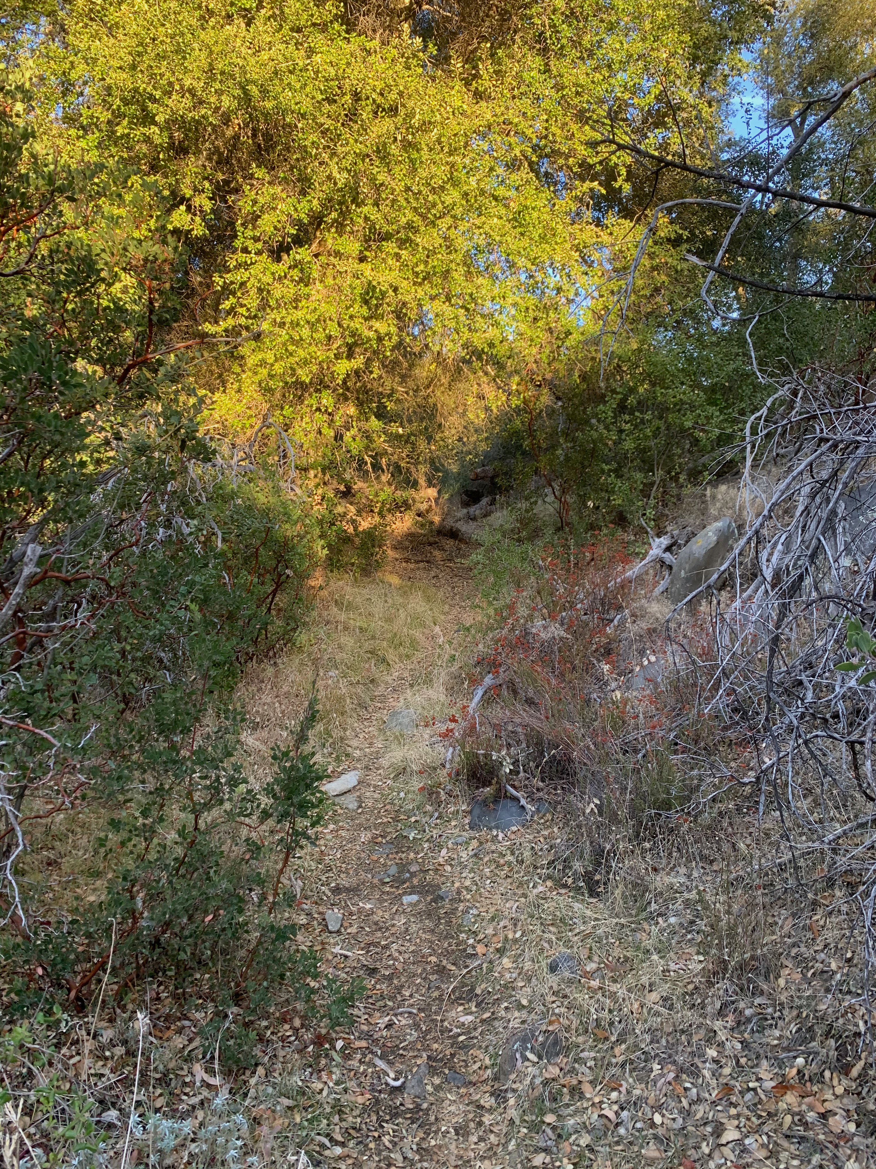I got to the trailhead a little after 7am and it was pretty cold – below freezing. After yesterday’s surprise snow on Granite Mountain, I clipped some Yaktrax to my pack and headed up. The trailhead is actually a bit hard to find – you have to backtrack down the road from the parking area and pass through a cattle gate that you actually can’t really see from the road. My track from January 2019 came in handy as a refresher. The trail begins by paralleling the road alongside a gully for nearly a mile. It’s a pretty walk, with riparian flora all around. Just before one mile the trail turns left (it’s well-marked) and begins an extremely rutted climb. At the turnoff I took off a layer, and also noticed some cat prints in the mud. They were smaller than the ones we saw yesterday, so I figured they were those of a bobcat – but all the same, whenever I went through thicker brush, I was loudly serenading the forests with whatever song came into my head!
