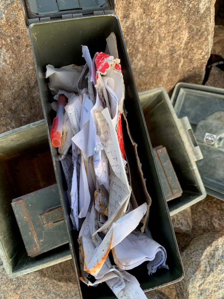 Finally at the summit I was surprised to see a couple already atop. They were very friendly, I think a dad and daughter (her name was Erica and she was 19). We chatted for a bit and Erica took my photo. As they started down, I started looking through the trail register ammo boxes. There were two, both inside of a larger case. One had a full notebook. The other had a messy crumple of papers. I had brought a new logbook with me so I wrote my name in it and placed it in the neater of the two boxes. I still wonder what to do with these messy caches. Erica said she looked through the mess and saw logs from 2006! My inclination is to clean out the box and bring the log papers home … but then what? I sure as hell don’t want to hang on to them, and certainly they should not be thrown away. I guess just taking the time to tidy up the box would have been good but it was cold up there and I did not want to take that on.