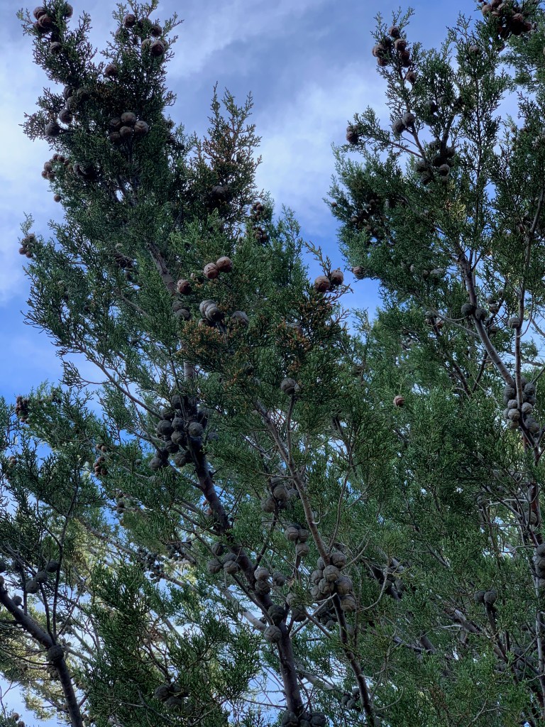 I had considered doing a second peak today – Long Valley Peak, just across the 8 and only a 4mi round-trip. But I decided I was pushing my luck with the family and should get home at a decent hour. But that meant that I could take my time with the current hike, so I decided to take the side trail down that goes by the groves of Tecate cypress. These are rare trees that are only found in a few places, including here. The side trail is steep, and is where I almost needed my Yaktrax, as it was snowy in places. However the snow was crunchy, not slippery; and it was easy to find dirt footholds around it. The unmarked use trail cuts steeply down around one of the Falsies, and then abruptly cuts to the right (south) back toward the main trail. It passes two larger groves of the trees but not close enough to observe, until it eventually comes right up to a few lovely specimens. I paused at one to take some photos and appreciate the tree … when I noticed several empty plastic water bottles of various types under the tree. WTF? Is this the “empty bottle” tree or something? As a hiker I passed later commented, how hard is it to hike your fucking empty water bottle out?? I usually hike with a trash bag but had forgotten to replace it recently so I was only able to carry out a few of them. So weird. (Messing around like this is why my time was not that much better than the first time I did this hike, following the same route.)