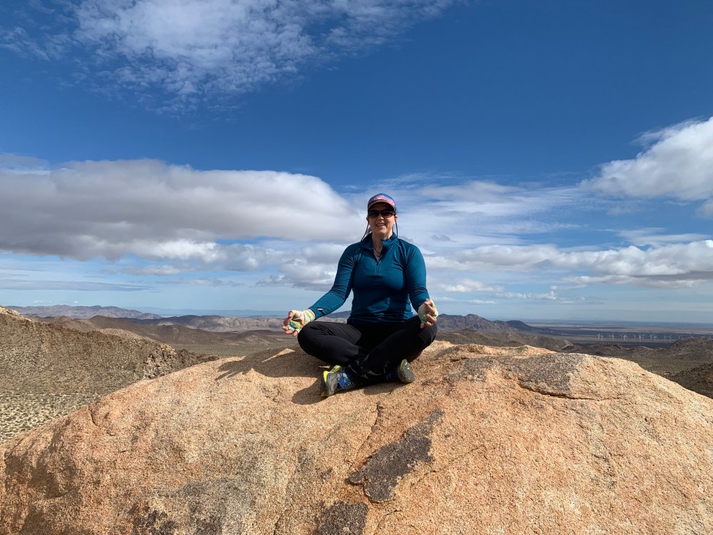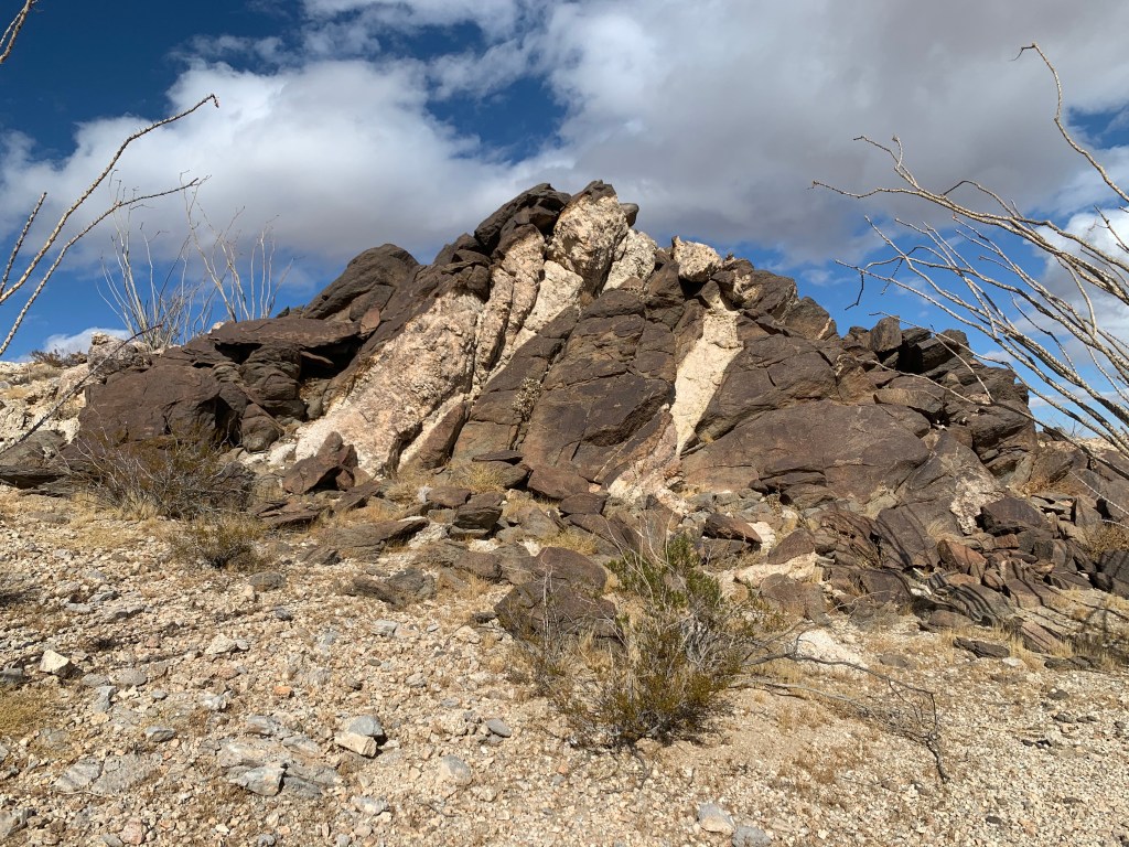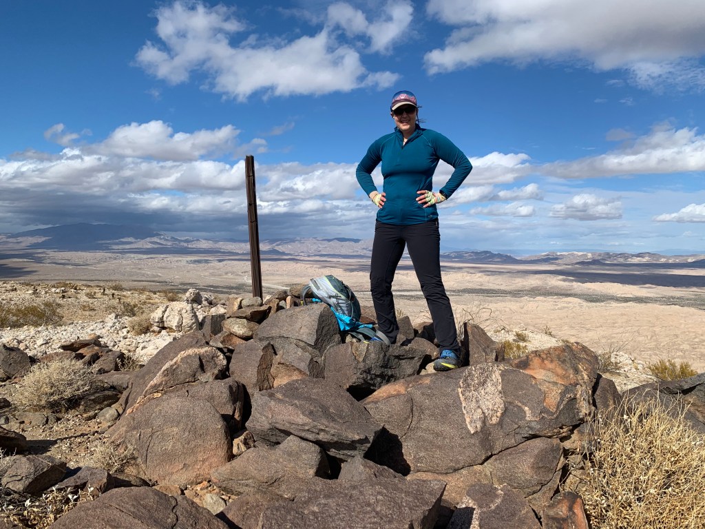 Back at the road, we took Tara’s Jeep a bit north alongside the railroad tracks, until we got to the wash leading to our next peak, Indian Hill. This is a spot I’ll need to return to; there are more petroglyphs and some caves here, along with some ruins from the railroad building days. We did not see any of this, as we were on a schedule! We climbed up the face of the peak to get to the top, and a slightly less steep – but more boulder-y – route back down. Number two in the bag.