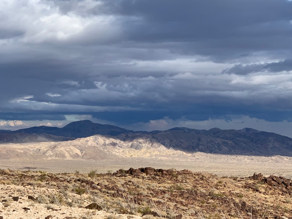 Our final peak was Red Hill, a volcanic mountain right across the S2 from the Mine Peak access road. This was a tough one to save for last, as it was the second longest; but we wanted to get Mine Peak over with as the access road would get tricky if the rain really started coming down (which it did not…). The route up Red Hill involved hiking overland to a ridge that wound its way around toward the summit. It was a bit indirect which was frustrating so late in the day, but we finally arrived at the top, an expansive flat area. We wandered about for a bit until we found the right pile of rocks with the trail register, and then headed back down, feeling incredibly accomplished. We did it! Four desert peaks in one day!
