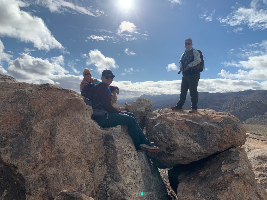 Next we drove back to the S2 and through the border checkpoint, taking a hairpin turn onto Dolomite Mine Road to the abandoned mine that the road and the peak were named after. Tara’s Jeep skills gave us a great head start up the trail. Beyond the deteriorated Jeep track, there were a few options for getting to the top of Mine Peak, and we opted for the middle route. The going was not too hard; steep in a few bits but with good footing. The summit view was different from the others, as this peak is on the east side of the ranges, and the view out to the Salton Sea was expansive. Three peaks done, one to go!