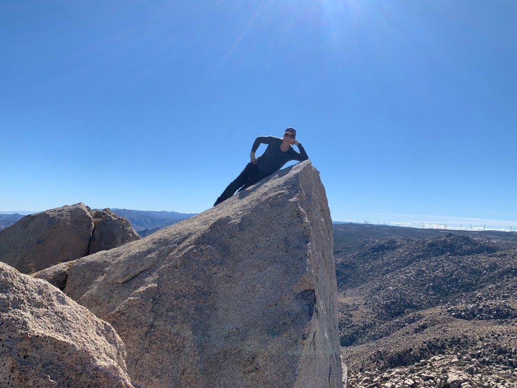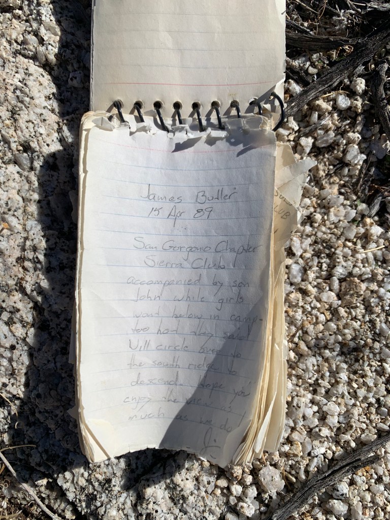 Soon we arrived at the quick boulder scramble up to the triangular summit, and voila! Peak #18! Paging through the register for this less well-known peak was fun – the oldest note we saw, waxing poetic, was from 1989. We also saw page after page of familiar names, from other peak bagging forums, the Sierra Club, and others in the San Diego hiking community.