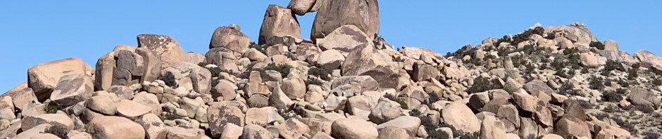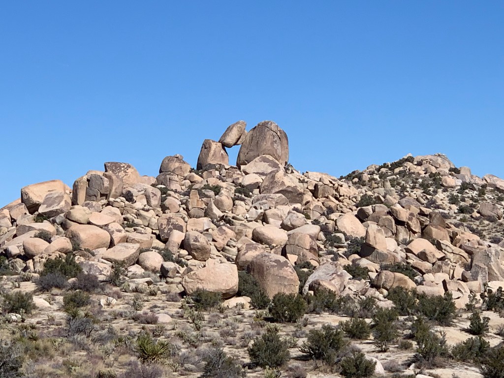 From the top we could see False Sombrero Peak, and it sure did look far away. After a rest, snacks, and photos, we climbed back down the opposite side of the peak, initially following the other main route up this peak via McCain Valley. In a short while, after passing some boulder piles, we diverged northward. The three-mile traverse between the two peaks was indeed relatively flat. We had a lot of route finding to do, mostly to get around brushy areas (bushwhacking through cactus and catclaw is NOT fun), but for much of the hike we could see our destination, and the GPX track we’d found was reliable.