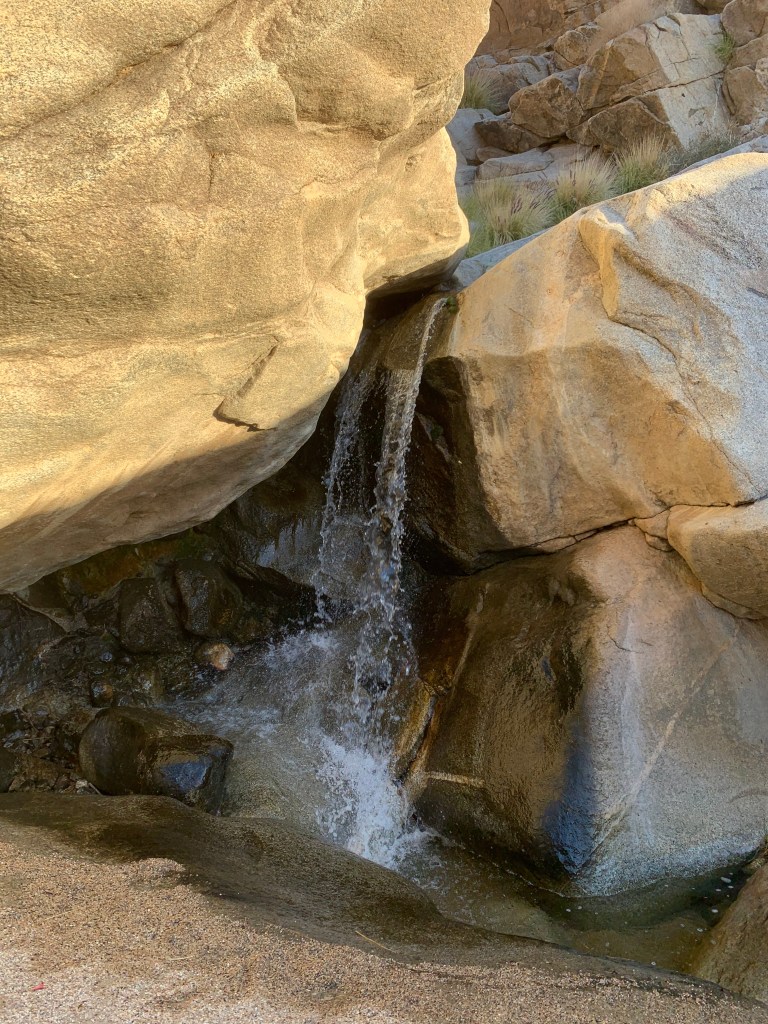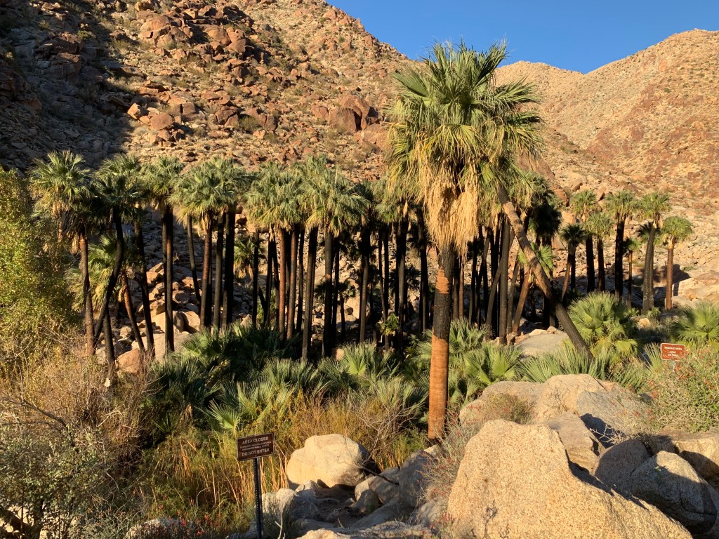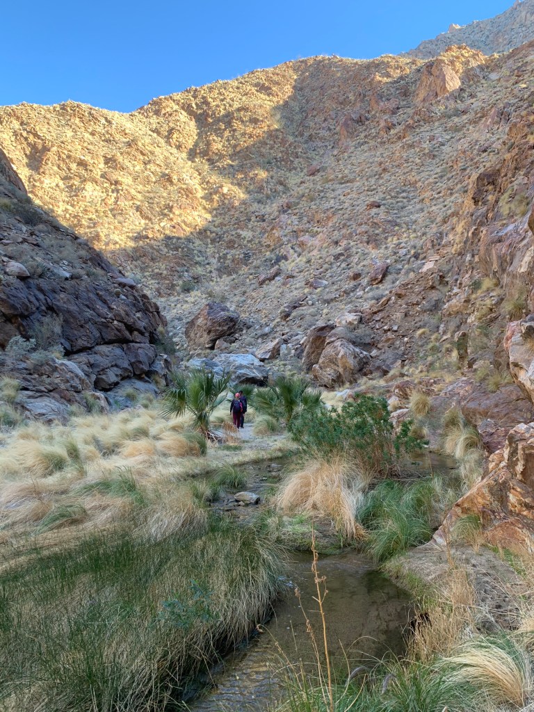 We met the fifth member of our hiking party at the trail head parking lot and got started a little after 6:30am. The hike begins in the beautiful and famous Palm Canyon, initially following a well-marked nature trail. We soon arrived at the first palm oasis, which was burned down by a juvenile arsonist in January 2020. It is making a rapid recovery with lots of new growth. Shortly past the oasis the nature trail ended and we continued, bouldering our way up alongside the flowing stream.