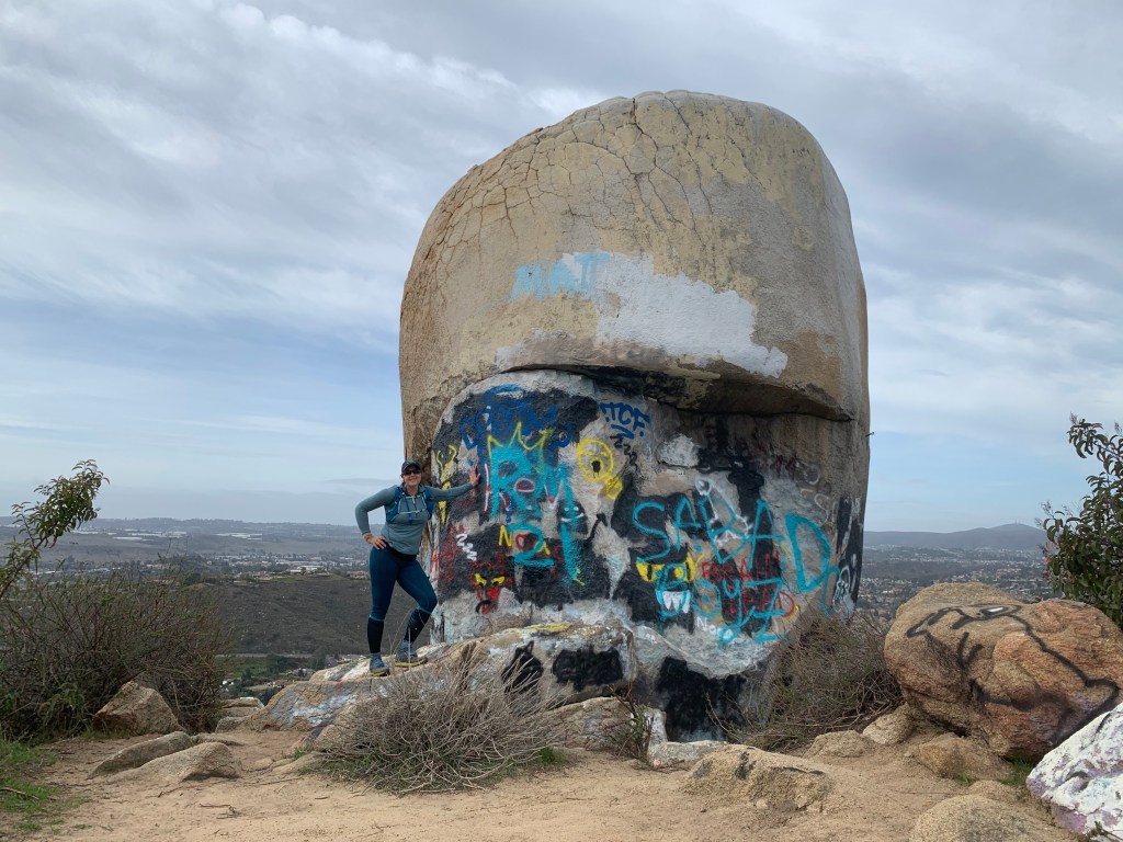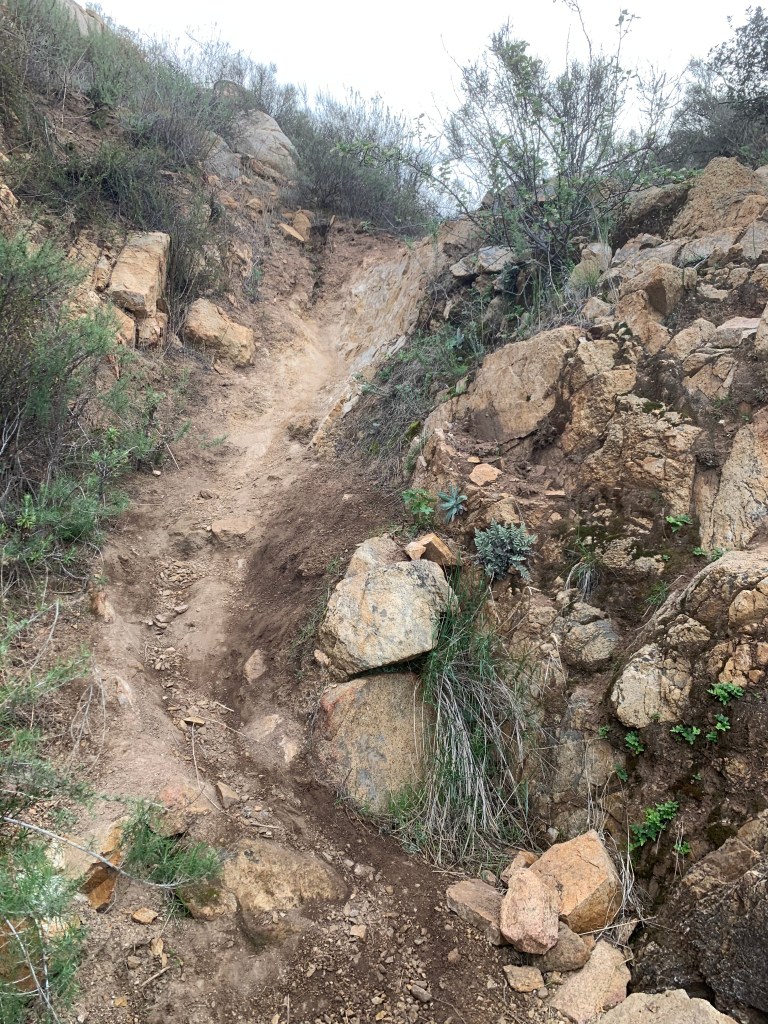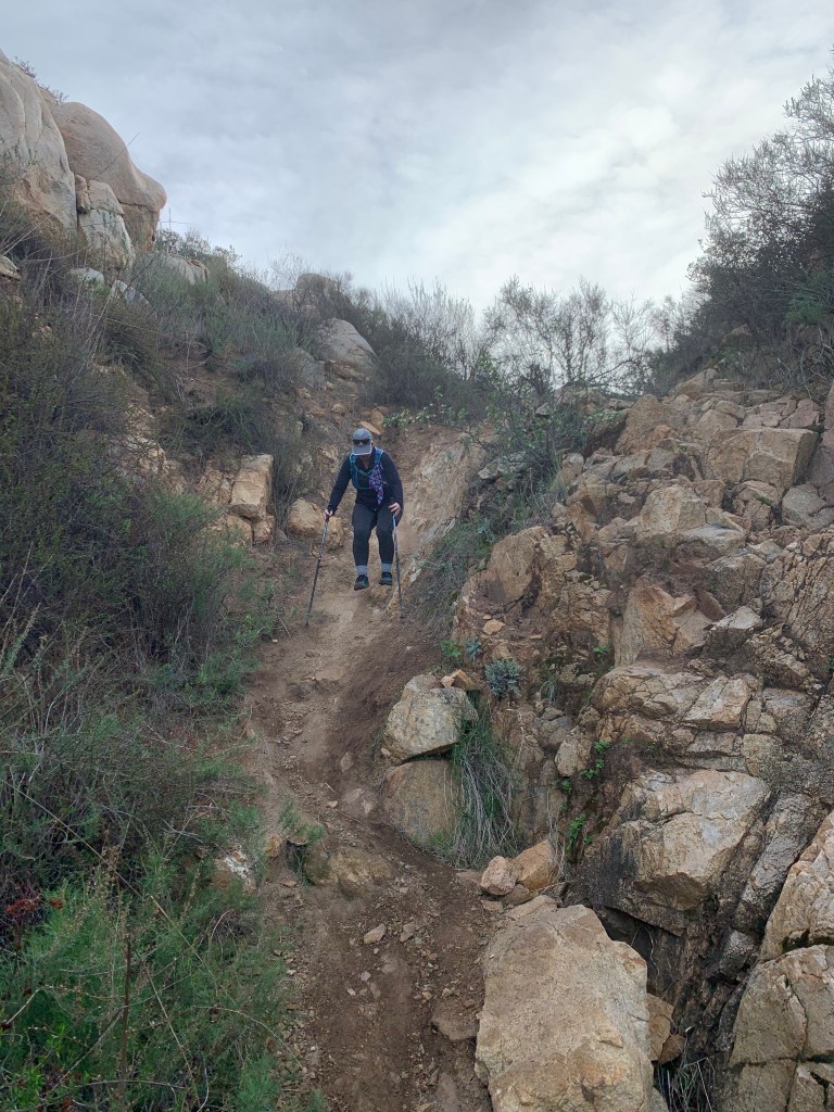 We hit Goat Peak first, because it was harder – only three miles, but it took us two hours. It was both more enjoyable and more difficult than expected, with some incredibly steep, rutted sections, a few dry waterfall scrambles, and a bit of bouldering at the summit. The trail starts out well-maintained in a lovely neighborhood, wending its way along Poway Creek. Soon it starts to climb up a steep dirt slope. The footing was tricky but the soil was damp, making it stickier and more stable underfoot. Eventually the trail dropped down to a saddle and we started seeing mountain bike jumps and obstacles – amazing that folks can ride their bikes back here! Some more scrambling and steep bits up a dry stream, then we finally arrived at the summit. We picked our way to the top, signed the register, and took our photos.