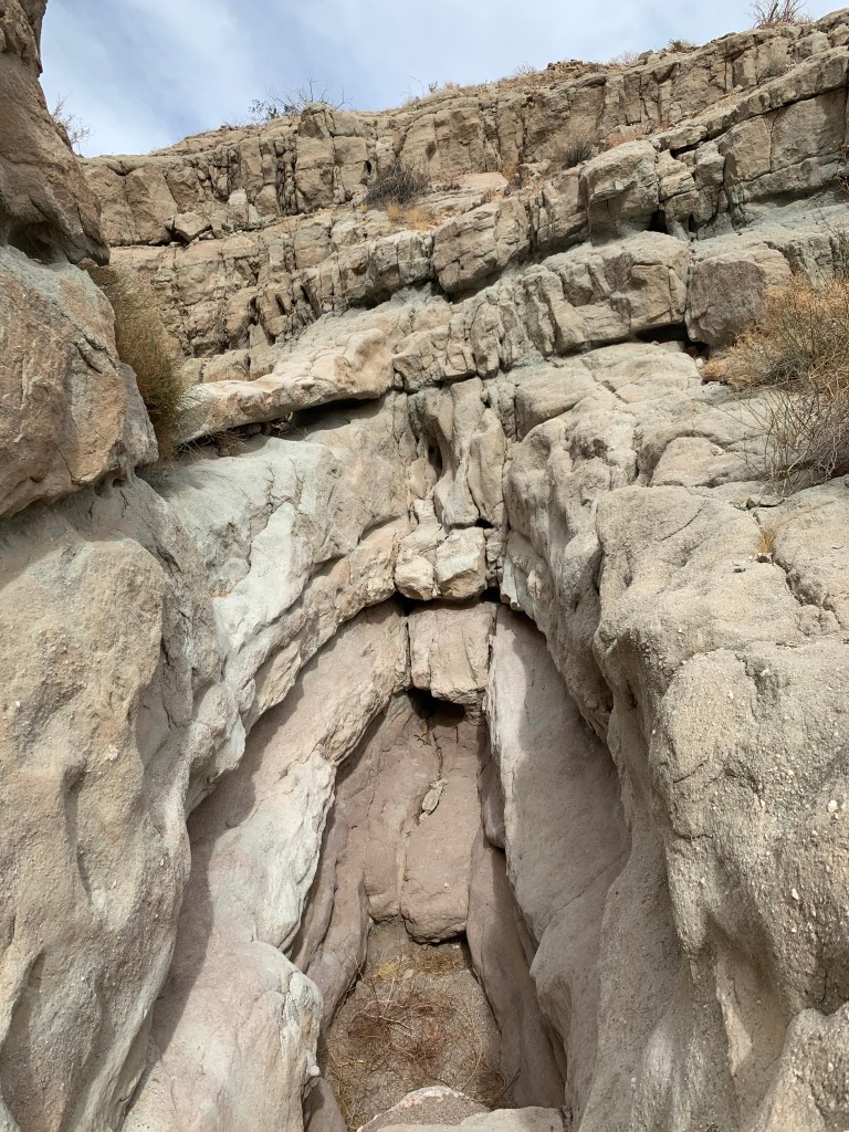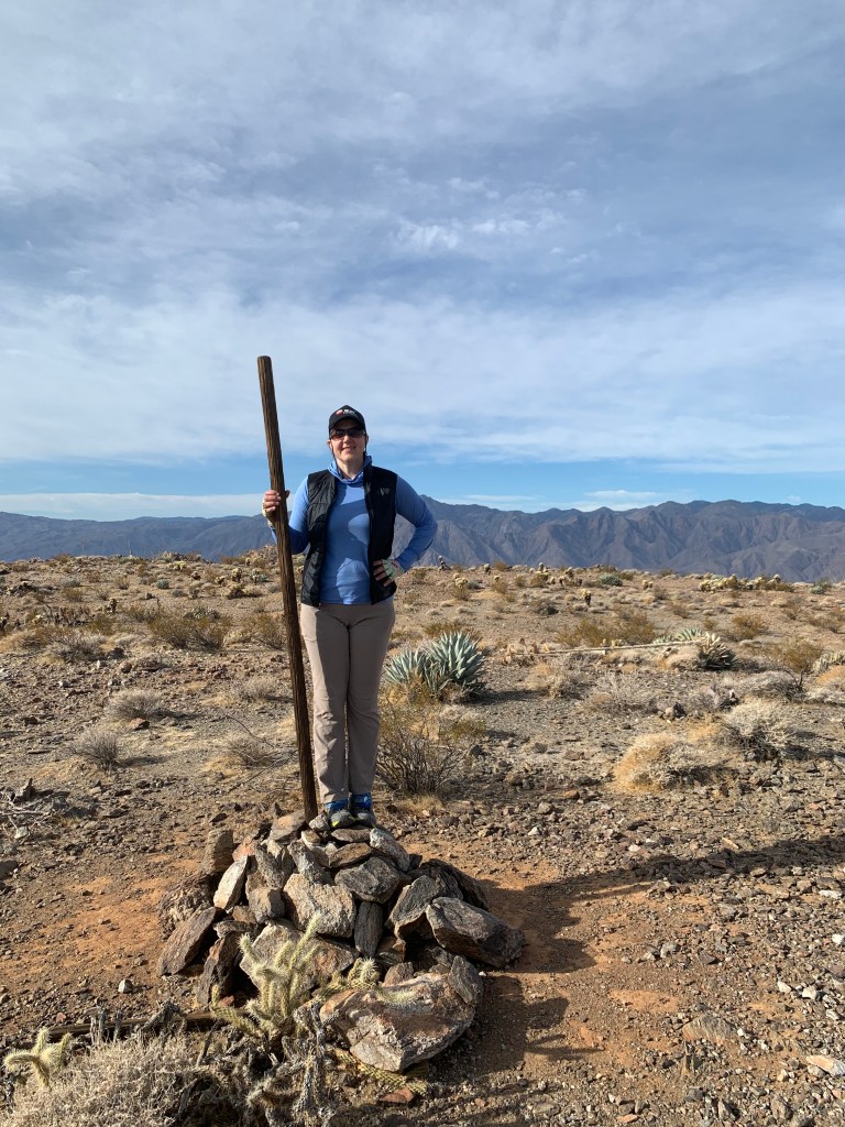 We drove back up the canyon and over Butte’s Pass proper, toward the East Butte of Borrego Mountain. We parked on the side of the road, avoiding the soft sand, and headed up the ridge. Arriving at a crux we studied the terrain: to the left, the path looked easier on the map (a more gradual ascent up the ridge). But to the right, the path looked easier in real life. We chose the path to the right. Wrong choice! We soon arrived at a rock climb that was not too difficult on its own, but it was exposed, steep, and nerve-wracking. We slowly maneuvered our way up, finally arriving, relieved, at the flat ridge. From there it was smooth sailing to the summit. And sailing is right – by now the wind was really howling, adding to the tension of the climb. There was a peak register that we hastily signed, took our summit snapshots, and started back down. This time we decided to try the northern route, which was absolutely the way to go. It’s subtle on the GPX track, but if anyone decides to copy our path, be sure to take that more northerly variation!