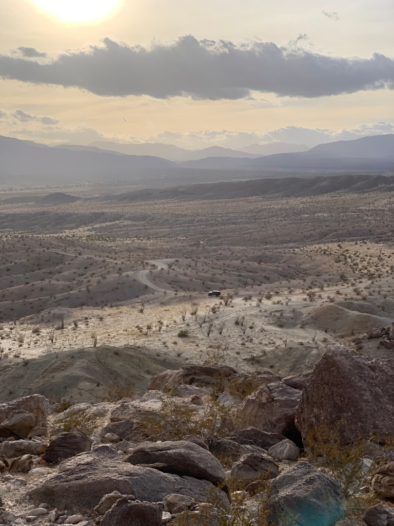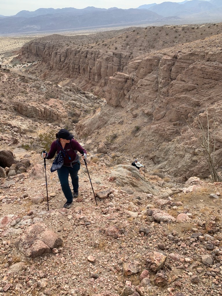 On Saturday at 1pm the four of us met at the turnoff to Buttes Pass. The normal route up to West Butte (aka Borrego Mountain West) starts at “The Slot.” Recently The Slot has become so popular that they’ve installed a bathroom, and have started charging $10 to park there. We decided to avoid all that and drive around further east to Hawk Canyon. We piled into Tara’s capable Jeep and drove down the sandy road to the somewhat crowded canyon, and parked for our hike. We started up via the canyon bottom, clamoring over up dry waterfalls and ascending one steep-ish slope to eventually merge with the main trail. The rest of the hike to West Butte was straightforward, with some attention needed to stay on the right track and not accidentally wander onto one of many viewpoint side trails here and there.