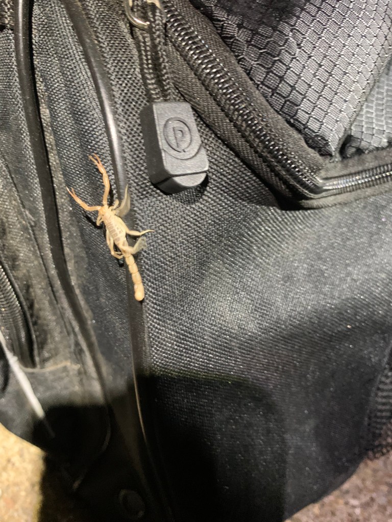 A few minutes after taking shelter, Kali sent out a text message – a scorpion had invaded her duffel bag in her tent’s vestibule! Excitement! We scrambled out to come and look. It was a little baby that had tucked itself into one of the zippered pockets. We helped Kali convince it to move along and find someplace else to spend the night.