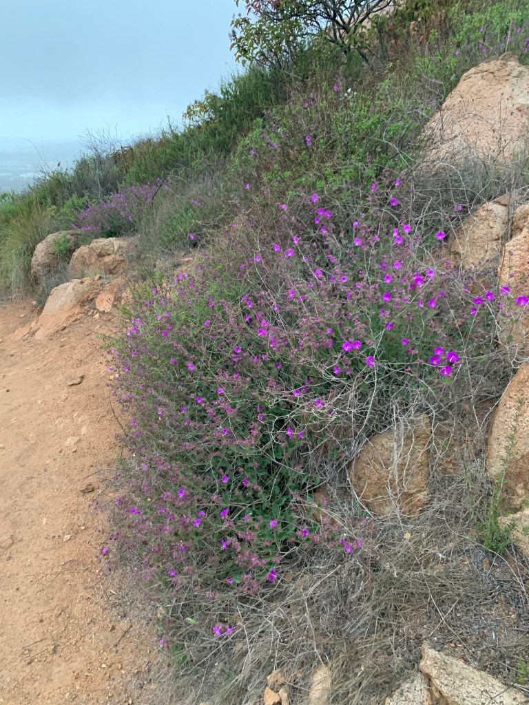 So I changed my plans and hit literally the most popular hike in San Diego County: Cowles Mountain. And Pyles Peak, of course – the trail to Pyles first passes by Cowles, so they are a two-fer. Cowles Mountain is in Mission Trails Regional Park, and as the highest peak in the city of San Diego, it gets a LOT of visitors. I have also done these peaks several times. The main trail up Cowles is fairly rocky, but well-marked and even though I was hiking solo I knew I would not be alone. The out-and-back was longer than Long Valley, but with no qualms about starting well before sunrise, it was a perfect choice for a dark, damp morning.