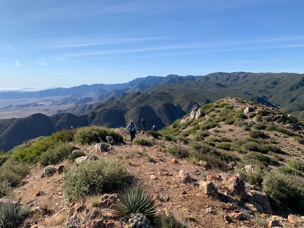 This weekend seemed perfect – the weather was forecasted to be cool and breezy. Also Tad & I were planning on heading up to our property near Mount Laguna this weekend to get some work done (building a latrine), so it was convenient for me personally. When we have multiple hikes planned, we always like to do the harder hike first, and that was Chariot Mountain. At 7am we met at the Pedro Fages trailhead. Today we had company – Bianca joined us! Yay! I have not hiked with her in quite some time, so it was great catching up with her.