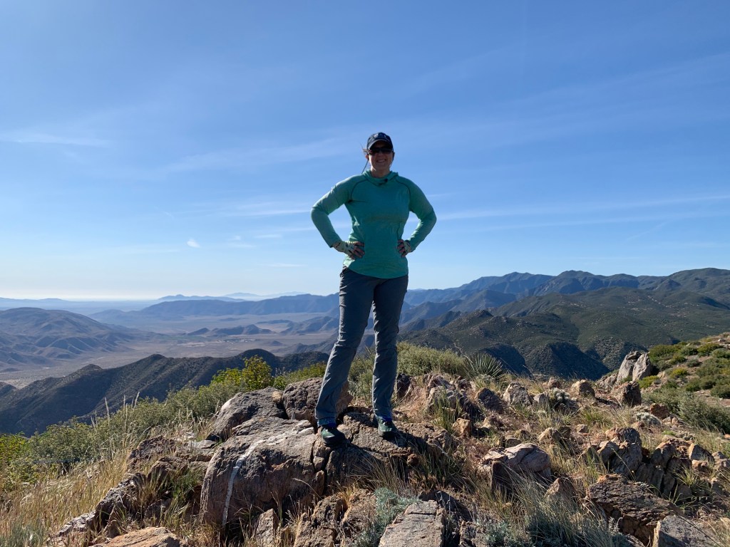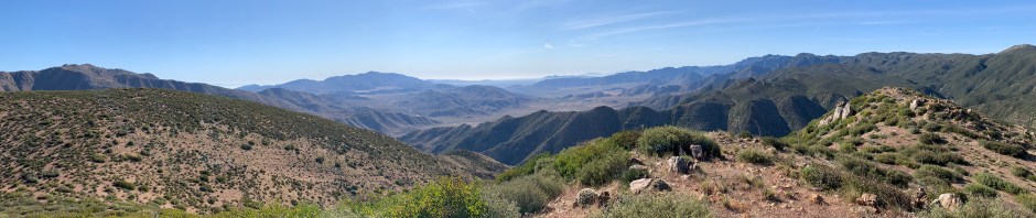 The trailheads for both of these peaks are along Sunrise Highway north of the Mount Laguna Recreation Area. But both peaks are east of the Laguna Crest, with the trails descending into canyons before rising up again to their respective peaks. Even though these seem like “Mount Laguna” hikes, they are really both desert hikes, nearly all within the boundaries of Anza-Borrego Desert State Park (Oriflamme’s peak itself is on BLM land). So even though I have said we must be done with the desert until the fall, we thought we could squeeze these two in before it gets even hotter.