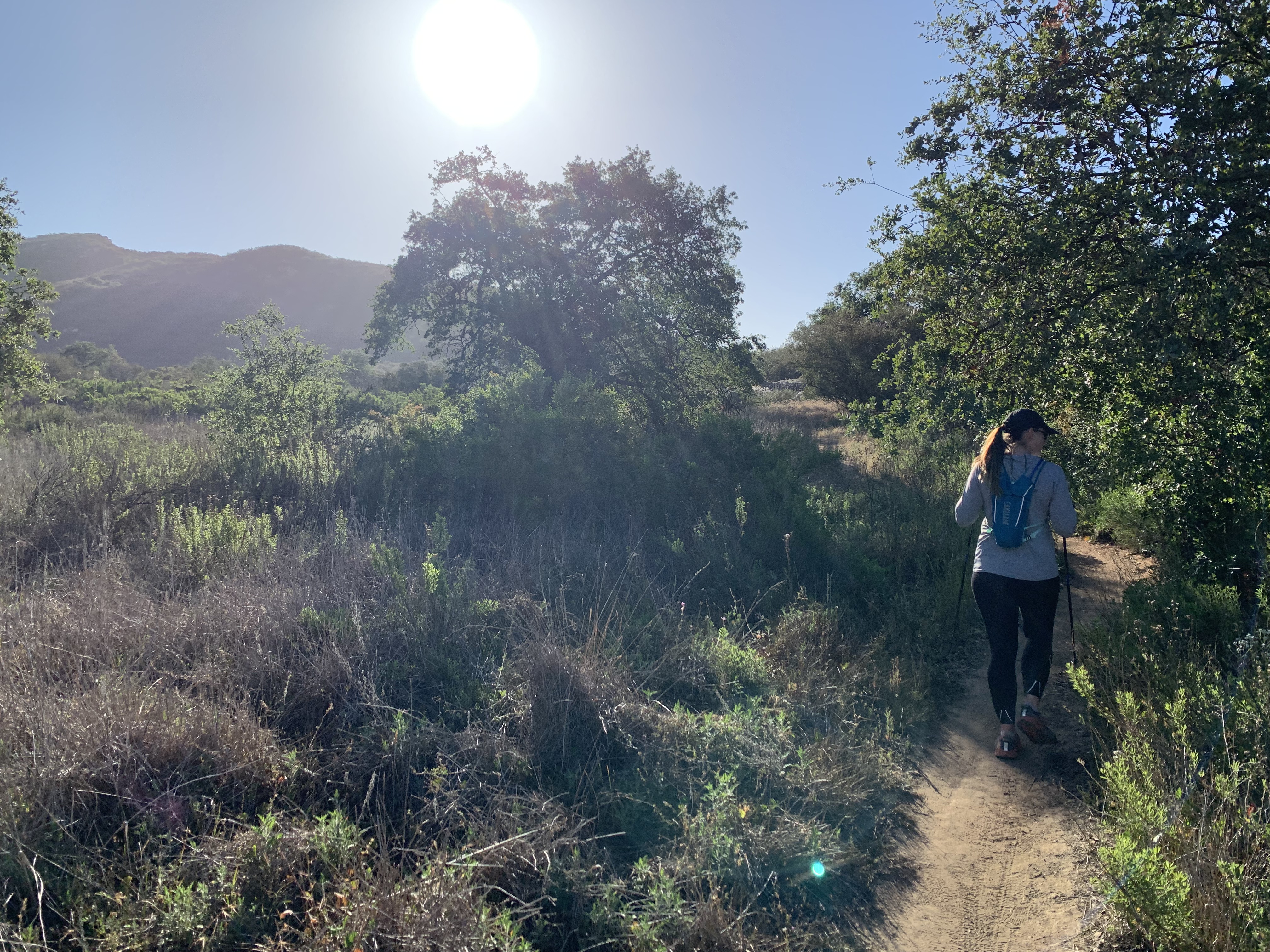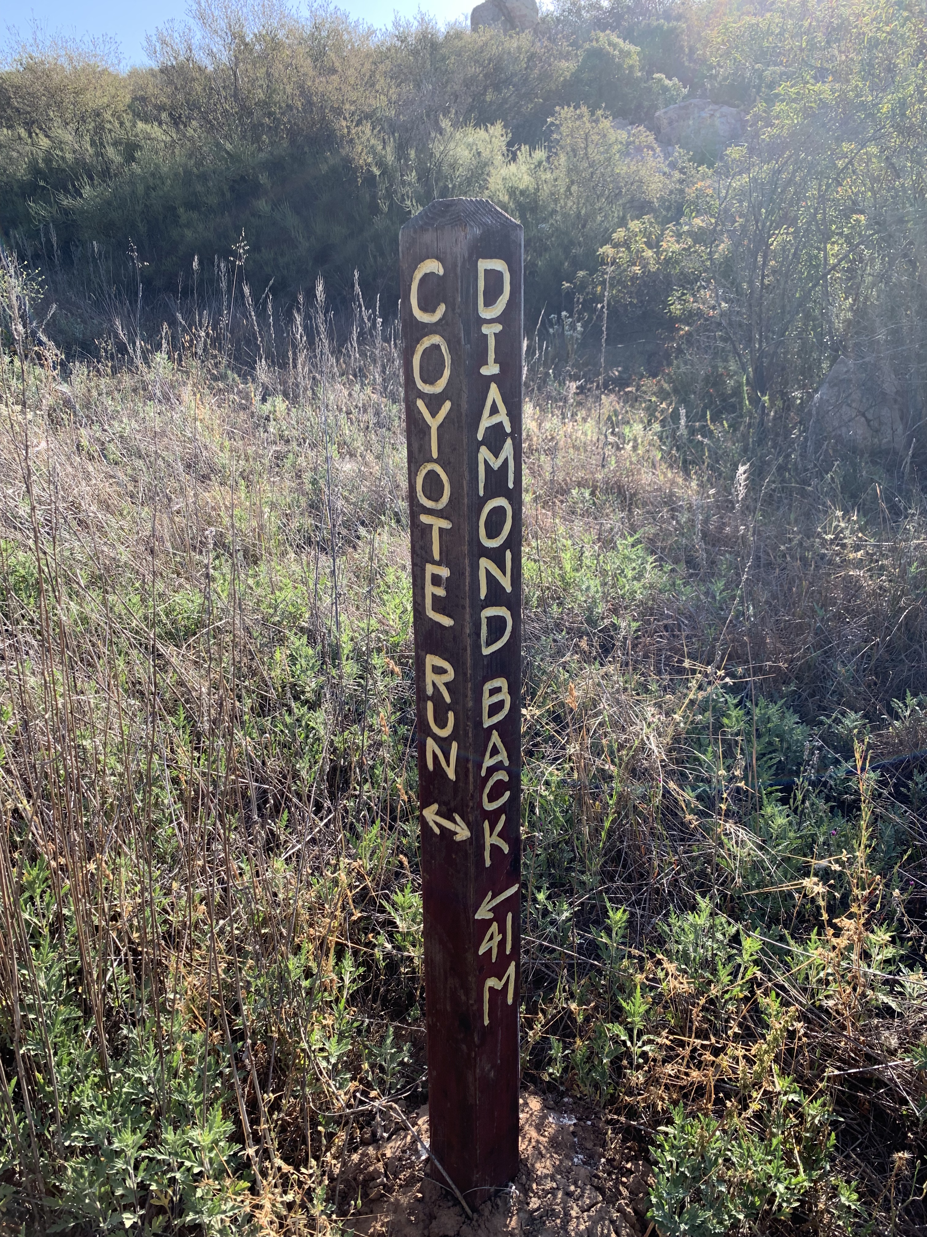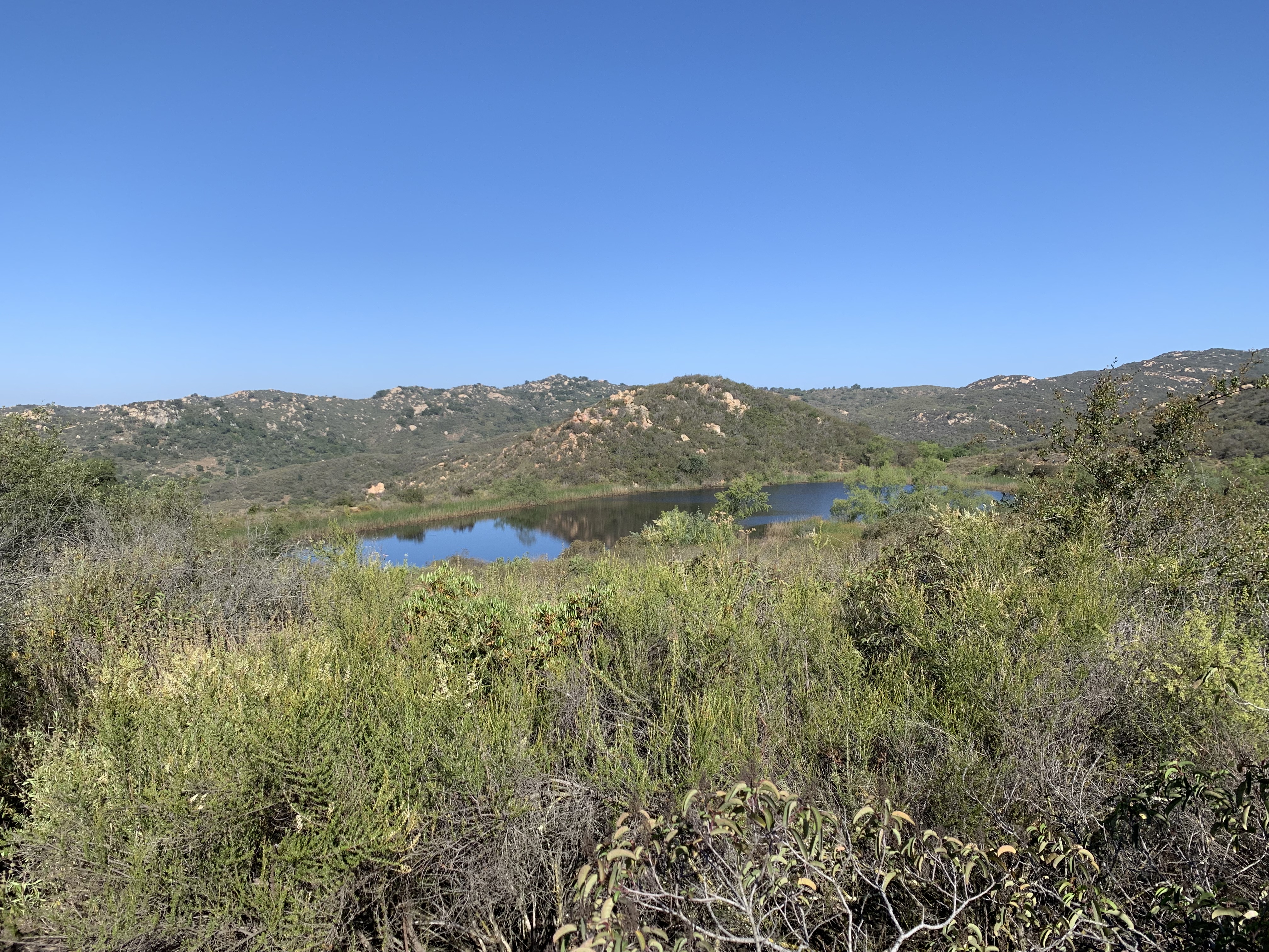 On Sunday we headed further up the 15 to hit Stanley Peak. This hike starts at Daley Ranch, which is a well-known San Diego hiking area… that I have never been to. Like yesterday, there are many trail options, and we chose the Creek Crossing Trail, heading up from the west side of the preserve near Dixon Lake. We arrived before 7am … and man, it’s the place to be! The parking lot – which was not small – was more than half full despite the early hour. It looked like mostly mountain bikers. We started up the trail and, despite the busy parking lot, we saw no one else on trail until we got closer to the summit. The trail was gradual and lovely until close to the summit when it got somewhat steeper. Arriving at the top we poked around the bushes, guessing where the high point was. Also at the top were some mountain bikers, and as we started back down, they flew – I mean FLEW! – past us. They were crazy!