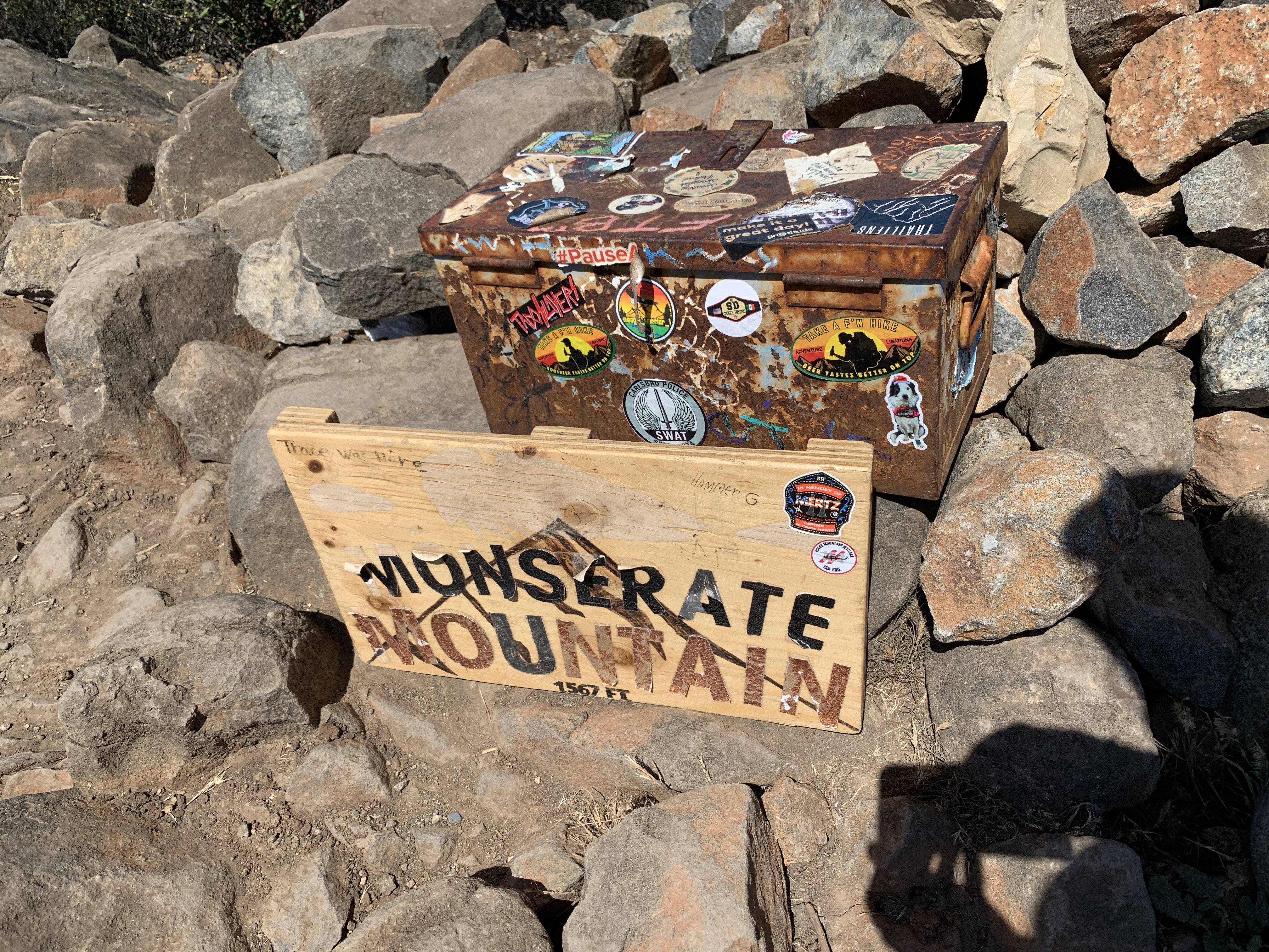 This trail was not kidding. If you look at the mileage versus elevation gain you’ll see that this trail is pretty freaking steep for a ho-hum urban hike. And it did not waste any time, I’ll tell you that. It was hard doing this after we’d already done nearly six miles climbing Stanley Peak. I was glad to have my sun umbrella with me and popped it up early in the hike to lots of admiring looks (and one child saying, “Oh! I wish I had that umbrella!!”). About a mile into the hike I bumped into a friend – yep that happens all the time when we hike! We finally got to the peak, took our pics and headed back down. (There was a huge ammo box with all kinds of junk in it, but I was not in the mood to paw through it and I opted not to sign anything.)