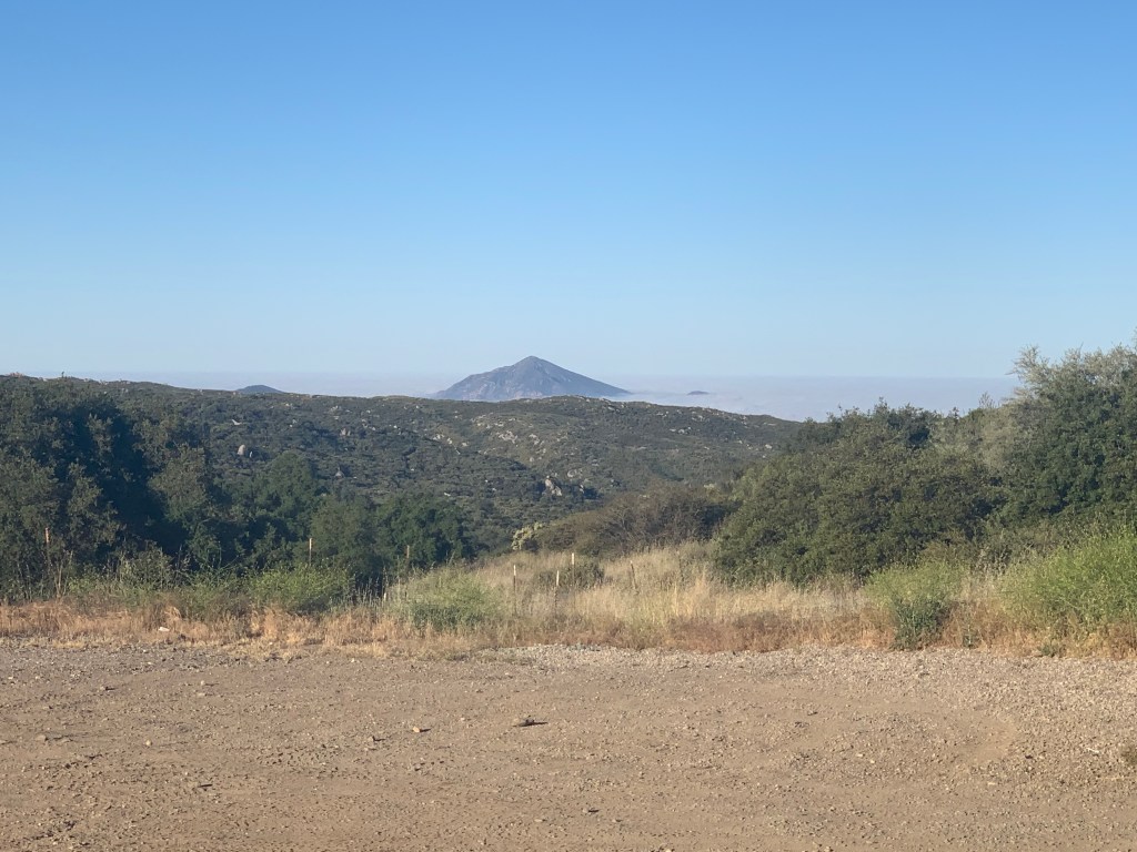 Back at the saddle, we turned right and headed up the road toward Los Pinos. Many consider this road walk to be boring, but I kind of liked it. It was not too steep, and it was easy to get into a meditative state. It was definitely in the blazing sun, but I had my hiking umbrella out. True to its name, it was flanked with pine trees – los pinos – unexpected in this part of San Diego, and actually quite lovely.