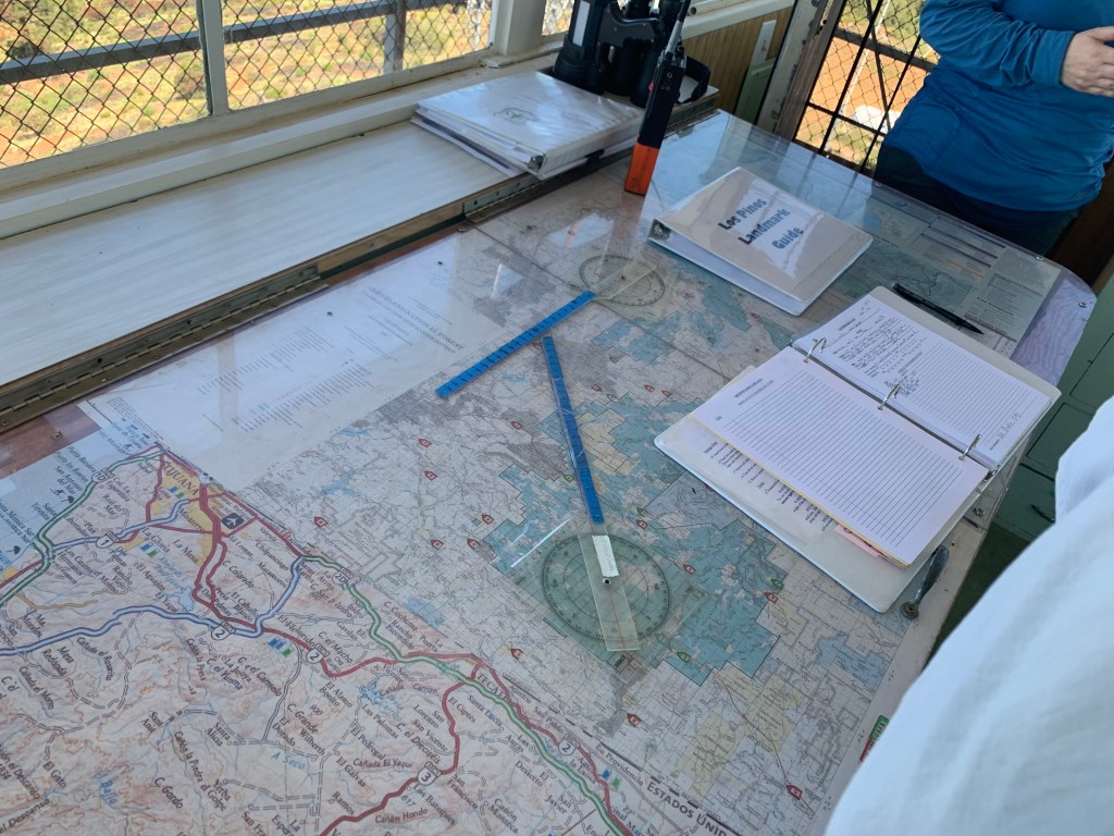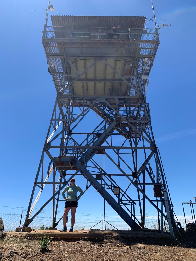 We arrived at the summit, came up to the base of the fire tower – and were greeted enthusiastically by the tower keeper. He invited us up, and we happily ascended to tour his domain. His name was Dave, and we spent the next hour immersed in his world. He showed us his hummingbird feeders – one on each side, and when a male hummingbird gets too territorial, he swaps out the sugar for plain water. All the other birds flock to the opposite side, and eventually the aggressive male figures it out and everyone gets along again. Inside the 12 x 12 foot interior, Dave’s explanations were interrupted – he was called over his radio by a fire crew somewhere off to the east, asking him to give the coordinates for the signal mirror they were flashing at him. We became quiet as he spoke to the fire crew – they were on a training exercise, and we got to see it first hand! Dave then explained his Osborne device to us, showed us his maps and tools, and explained his various responsibilities. He showed us photos of ringtail cats, rattlesnakes, birds of prey, and other regular visitors to his domain. It was an amazing experience and we learned so much. Peak #72!