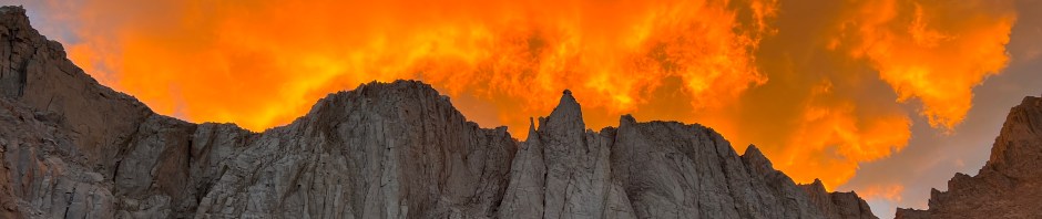 I’d also planned an extra day of acclimation, and on the Saturday after Labor Day, Kali & I headed up to Horseshoe Meadows, a walk-up campground at 10,000 feet just south of Whitney Portal. The forecast called for rain that night – and it sure did rain – but for it to clear up by Monday. Our plan was to do an easy backpack to Cottonwood Lakes on Saturday, then on Sunday, drive in to Lone Pine for lunch, then make our way up to a reserved campsite at Whitney Portal. On Sunday morning, as we descended back into cell phone coverage, my texts started to arrive… including one from the guide service. Now, they are used to bad weather up here, and as a result, they almost never cancel due to weather – they strongly recommend purchasing trip insurance for this very reason. But the weather forecast on Monday had changed, and was now looking so awful that even Trevor did not want to climb that day. He offered to let us reschedule. We stopped at the Alabama Hills Café for lunch to ponder our options. With resignation and disappointment, we hit the road toward home. What else is this mountain going to throw in my way!!??